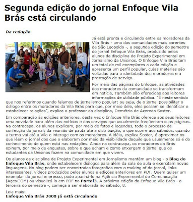 É muito bom ver o trabalho da turma no jornal. Essa cadeira se mostrou muito interessante, contudo, apresentou bastante dificuldades para seus alunos. Não falo do trabalho de coletar, redigir e editar as notícias e fotos. Falo das dificuldades pessoais de cada um para se deslocar de suas casas e de se desprender de outras responsabiliades aos sábados pela manhã. Realmente não foi fácil conseguir tempo para postar no blog, diante de compromissos massantes como o TCC, ativides de outras cadeiras e o serviço diário que garante alguns trocados no fim do mês para os alunos do professor Demétrio.